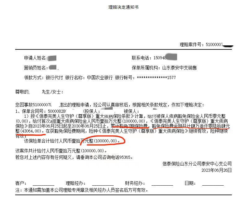 交了三次后于2023年4月不幸查出來胰腺癌,6月25日下午泰安分公司侯玉濤經(jīng)理幫助客戶整理遞交了理賠資料,6月26日結(jié)案,按合同約定賠付客戶10萬并豁免了后續(xù)七期的保險費(fèi)43064元,重疾保障繼續(xù)有效。