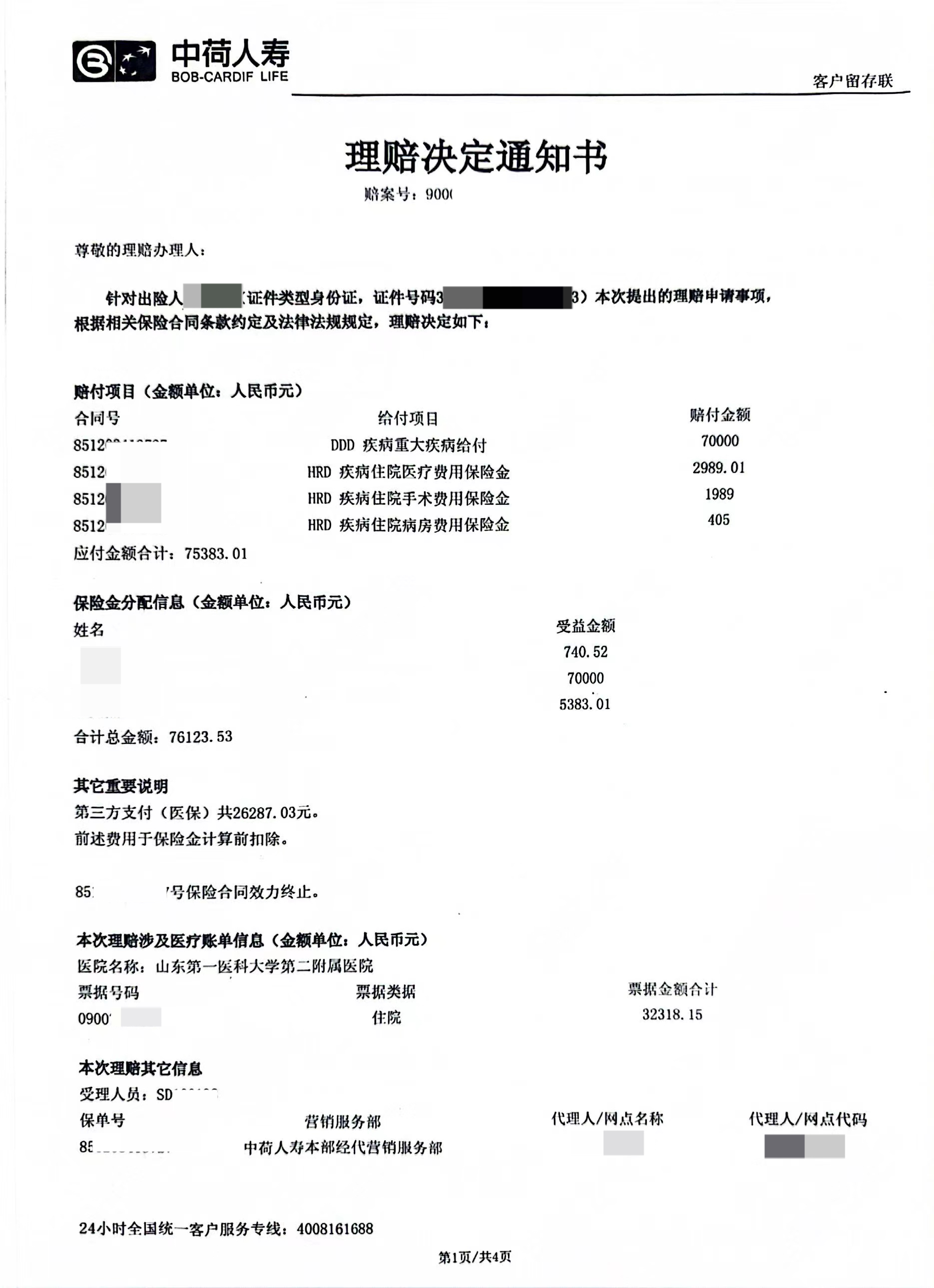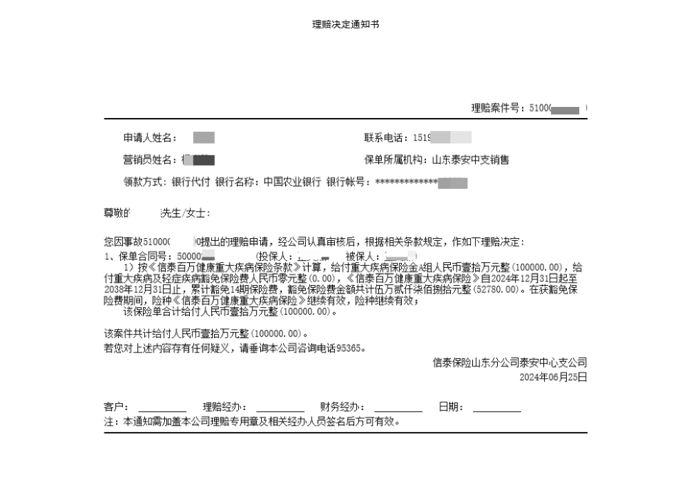 非常不幸的是,王女士在2024年五月份查體的時候確診為肺癌,住院切除了一葉肺,住院職工醫(yī)保報銷后自費6000多元??蛻舫鲈汉筇峤涣死碣r申請,中荷人壽按合同約定賠付了76123.53元;信泰人壽按合同約定賠付了10萬,并豁免了后續(xù)14期保費52780元,合同繼續(xù)有效。