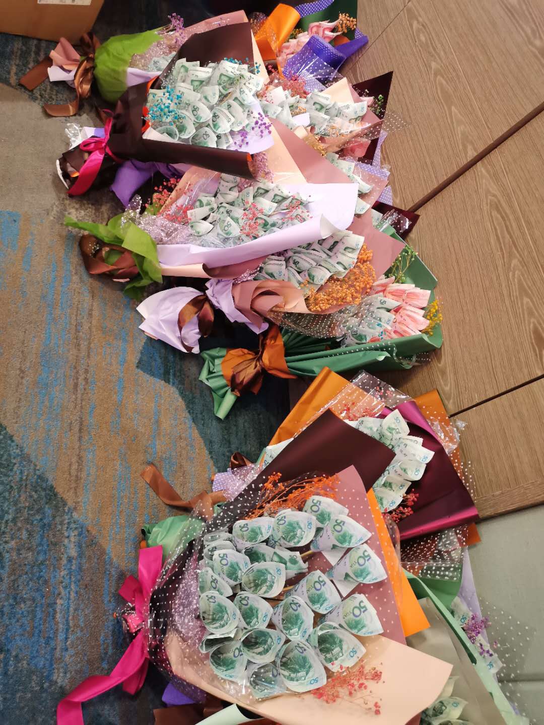 14日晚,榮譽(yù)宴在舜和柏曼酒店舉行,每位達(dá)成季度之星的伙伴現(xiàn)場(chǎng)都拿到了用“毛爺爺”包成的錢花,每個(gè)人臉上都洋溢著幸福開心的笑容。