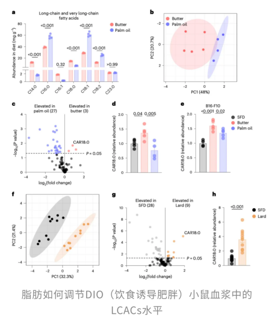 更有意思的是,這一現(xiàn)象并不僅限于黃油。當(dāng)研究人員將飲食脂肪來源換成同樣富含飽和脂肪酸的豬油后,依舊觀察到CAR18:0水平居高不下,提示這種代謝物的積累很可能是動(dòng)物脂肪代謝的一種普遍特征,而非個(gè)別飲食配方的特例。