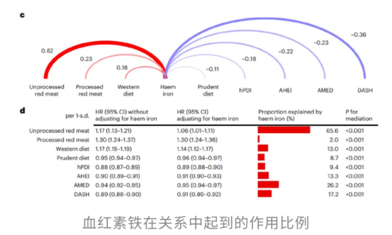 為了弄清楚血紅素鐵到底“背了多少鍋”,研究者還做了中介分析。結(jié)果發(fā)現(xiàn),在未加工紅肉引發(fā)的糖尿病風(fēng)險(xiǎn)中,有多達(dá)65.6%的部分可歸因于血紅素鐵的攝入。