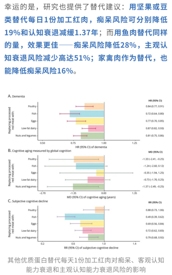 研究結(jié)果表明:每天攝入≥21g加工紅肉的參與者相比于攝入<8.5g的參與者,患癡呆的風(fēng)險(xiǎn)升高13%,主觀認(rèn)知衰退的風(fēng)險(xiǎn)增加14%。并且每增加1份(約85g)加工紅肉的攝入,整體認(rèn)知衰退和言語記憶衰退分別加速1.61年和1.69年。