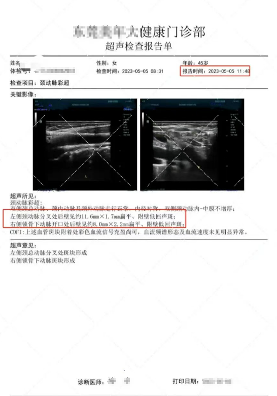 東莞某女士,45歲,2023年5月5日體檢彩超結(jié)果顯示,左側(cè)頸動(dòng)脈分叉處后壁見(jiàn)約11.6mmx1.7mm扁平、附壁低回聲;右側(cè)鎖骨下動(dòng)脈開(kāi)口處后壁見(jiàn)約8.0mmx2.2mm扁平、附壁低回聲斑。左側(cè)頸總動(dòng)脈分叉處斑塊形成,右側(cè)鎖骨下動(dòng)脈斑塊形成。